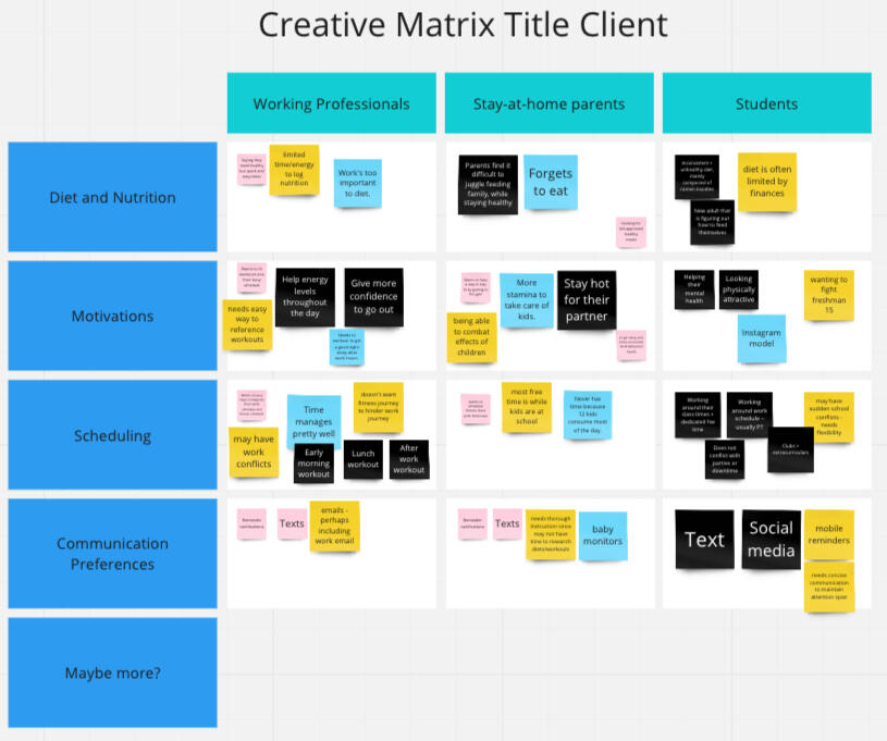 The answers we received pointed us in a direction for the application development. Before creating any low fidelity mockups we organized our ideas into a creative matrix and finally a detailed User Journey that gave us a visual for the phases a client would likely go through.